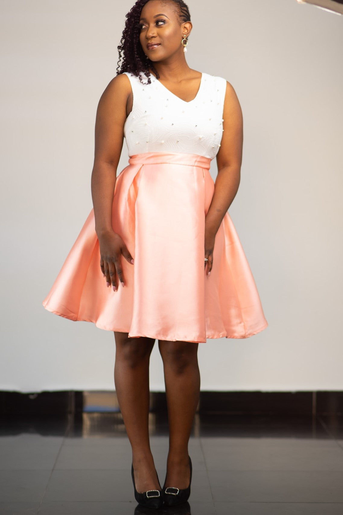 Faux Pearl Trim Skater Dress - Peach and White